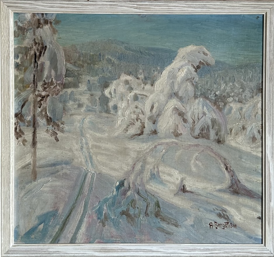 Her har det ikke vært kjørt opp løype, men en skiløper på treski, kanskje smurt med stearinlys, har vært her. Det har Bergstrøm også. Vi har sett bilder med vintermotiv før, men det har vært barns lek med spark etc. i bygatene. Bergstrøm og hans malervenner var mye på farten i naturen på jakt etter motiver, men ikke om vinteren. Maleriet henger i dag på veggen hos Eva på Sørlandet. (06.09.25)